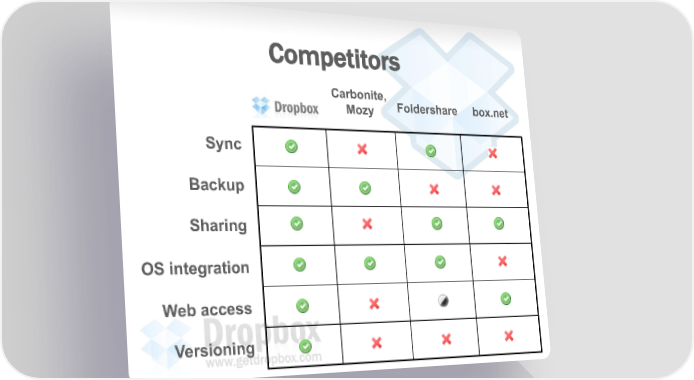 Dropbox Pitch to Sequoia | 2007 Page 9 Page 11Competitors Carbonite, Foldershare box.net Mozy Sync Backup Sharing OS integration Webaccess Versioning