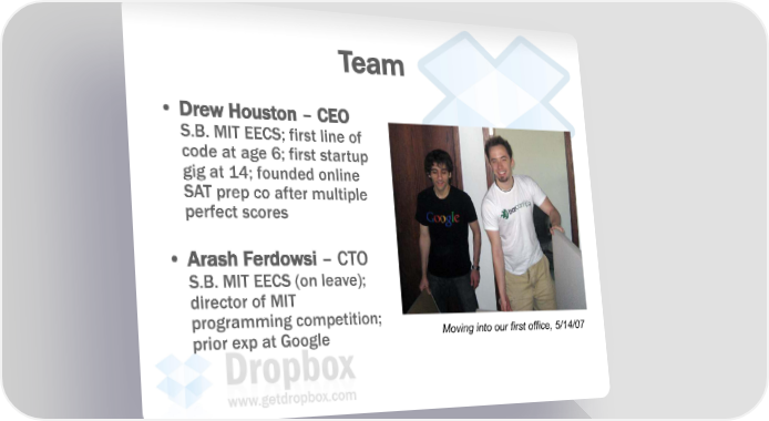 Team Drew Houston CEO • – S.B. MIT EECS; first line of code at age 6; first startup gig at 14; founded online SAT prep co after multiple perfect scores •Arash Ferdowsi – CTO S.B. MIT EECS (on leave); director of MIT programming competition; Moving into our first office, 5/14/07 prior exp at Google