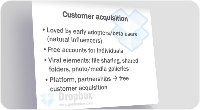 Customer acquisition •Loved by early adopters/beta users (natural influencers) •Free accounts for individuals •Viral elements: file sharing, shared folders, photo/media galleries •Platform, partnerships à free customer acquisition