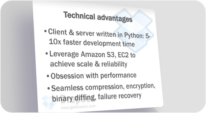 Technical advantages •Client & server written in Python: 5- 10x faster development time •Leverage Amazon S3, EC2 to achieve scale & reliability •Obsession with performance •Seamless compression, encryption, binary diffing, failure recovery