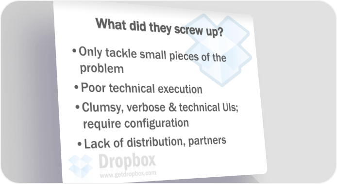 Dropbox Pitch to Sequoia | 2007 Page 10 Page 12What did they screw up? •Only tackle small pieces of the problem •Poor technical execution •Clumsy, verbose & technical UIs; require configuration •Lack of distribution, partners