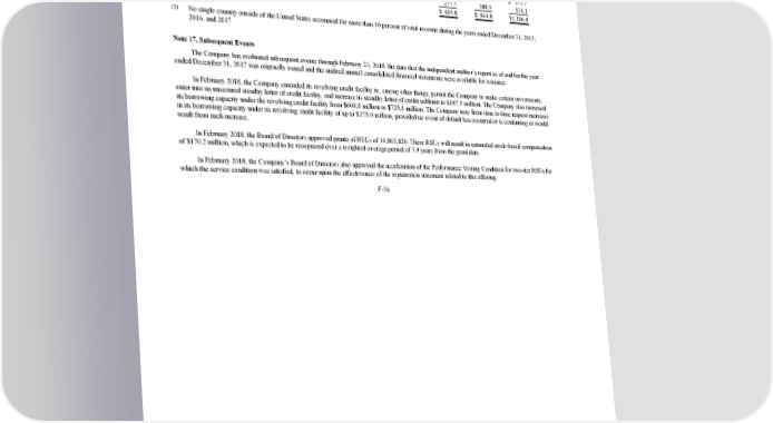 2/24/2018 S-1 Table of Contents Revenue Revenue by geography is generally based on the address of the customer as defined in the Company’s subscription agreement. The following table sets forth revenue by geographic area for the years ended December 31, 2015, 2016, and 2017. Year ended December 31, 2015 2016 2017 United States $ 326.1 $ 455.9 $ 575.7 (1) International 277.7 388.9 531.1 Total revenue $ 603.8 $ 844.8 $1,106.8 (1) No single country outside of the United States accounted for more than 10 percent of total revenue during the years ended December 31, 2015, 2016, and 2017 Note 17. Subsequent Events The Company has evaluated subsequent events through February 23, 2018, the date that the independent auditor’s report as of and for the year ended December 31, 2017 was originally issued and the audited annual consolidated financial statements were available for issuance. In February 2018, the Company amended its revolving credit facility to, among other things, permit the Company to make certain investments, enter into an unsecured standby letter of credit facility, and increase its standby letter of credit sublimit to $187.5 million. The Company also increased its borrowing capacity under the revolving credit facility from $600.0 million to $725.0 million. The Company may from time to time request increases in its borrowing capacity under its revolving credit facility of up to $275.0 million, provided no event of default has occurred or is continuing or would result from such increase. In February 2018, the Board of Directors approved grants of RSUs of 14,865,820. These RSUs will result in estimated stockbased compensation of $170.2 million, which is expected to be recognized over a weightedaverage period of 3.9 years from the grant date. In February 2018, the Company’s Board of Directors also approved the acceleration of the Performance Vesting Condition for twotier RSUs for which the service condition was satisfied, to occur upon the effectiveness of the registration statement related to this offering. F36 https://www.sec.gov/Archives/edgar/data/1467623/000119312518055809/d451946ds1.htm 226/235