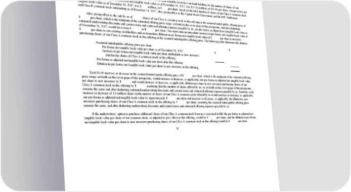2/24/2018 S-1 Table of Contents DILUTION If you invest in our Class A common stock in this offering, your ownership interest will be diluted to the extent of the difference between the initial public offering price per share of our Class A common stock and the pro forma as adjusted net tangible book value per share of our common stock immediately after this offering. Net tangible book value dilution per share to new investors represents the difference between the amount per share paid by purchasers of shares of our Class A common stock in this offering and the pro forma as adjusted net tangible book value per share of our common stock immediately after completion of this offering. Net tangible book value per share is determined by dividing our total tangible assets less our total liabilities by the number of shares of our common stock outstanding. Our historical net tangible book value as of December 31, 2017, was $(13.0) million, or $(0.04) per share. Our pro forma net tangible book value as of December 31, 2017, was $ million, or $ per share, based on the total number of shares of our Class A common stock and Class B common stock outstanding as of December 31, 2017, after giving effect to the Capital Stock Conversions and the RSU Settlement. After giving effect to the sale by us of shares of our Class A common stock in this offering at the assumed initial public offering price of $ per share, which is the midpoint of the estimated offering price range set forth on the cover page of this prospectus, and after deducting estimated underwriting discounts and commissions and estimated offering expenses payable by us, our pro forma as adjusted net tangible book value as of December 31, 2017, would have been $ , or $ per share. This represents an immediate increase in pro forma net tangible book value of $ per share to our existing stockholders and an immediate dilution in pro forma net tangible book value of $ per share to investors purchasing shares of our Class A common stock in this offering at the assumed initial public offering price. The following table illustrates this dilution: Assumed initial public offering price per share $ Pro forma net tangible book value per share as of December 31, 2017 $ Increase in pro forma net tangible book value per share attributable to new investors purchasing shares of Class A common stock in this offering Pro forma as adjusted net tangible book value per share after this offering Dilution in pro forma net tangible book value per share to new investors in this offering Each $1.00 increase or decrease in the assumed initial public offering price of $ per share, which is the midpoint of the estimated offering price range set forth on the cover page of this prospectus, would increase or decrease, as applicable, our pro forma as adjusted net tangible book value per share to new investors by $ , and would increase or decrease, as applicable, dilution per share to new investors purchasing shares of our Class A common stock in this offering by $ , assuming that the number of shares offered by us, as set forth on the cover page of this prospectus, remains the same and after deducting estimated underwriting discounts and commissions and estimated offering expenses payable by us. Similarly, each increase or decrease of 1.0 million shares in the number of shares of our Class A common stock offered by us would increase or decrease, as applicable, our pro forma as adjusted net tangible book value by approximately $ per share and increase or decrease, as applicable, the dilution to new investors purchasing shares of our Class A common stock in this offering by $ per share, assuming the assumed initial public offering price remains the same, and after deducting underwriting discounts and commissions and estimated offering expenses payable by us. If the underwriters’ option to purchase additional shares of our Class A common stock from us is exercised in full, the pro forma as adjusted net tangible book value per share of our common stock, as adjusted to give effect to this offering, would be $ per share, and the dilution in pro forma net tangible book value per share to new investors purchasing shares of our Class A common stock in this offering would be $ per share. 52 https://www.sec.gov/Archives/edgar/data/1467623/000119312518055809/d451946ds1.htm 59/235