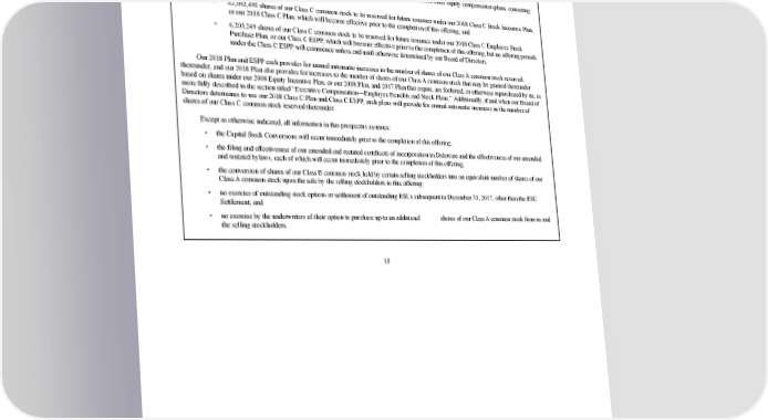 2/24/2018 S-1 Table of Contents and will be added to the shares of our Class A common stock to be reserved for future issuance under our 2018 Plan upon its effectiveness; • 6,205,249 shares of our Class A common stock to be reserved for future issuance under our 2018 Employee Stock Purchase Plan, or our ESPP, which will become effective prior to the completion of this offering, but no offering periods under the ESPP will commence unless and until otherwise determined by our Board of Directors; and • 68,257,739 shares of our Class C common stock reserved for future issuance under certain other equity compensation plans, consisting of: • 62,052,490 shares of our Class C common stock to be reserved for future issuance under our 2018 Class C Stock Incentive Plan, or our 2018 Class C Plan, which will become effective prior to the completion of this offering; and • 6,205,249 shares of our Class C common stock to be reserved for future issuance under our 2018 Class C Employee Stock Purchase Plan, or our Class C ESPP, which will become effective prior to the completion of this offering, but no offering periods under the Class C ESPP will commence unless and until otherwise determined by our Board of Directors. Our 2018 Plan and ESPP each provides for annual automatic increases in the number of shares of our Class A common stock reserved thereunder, and our 2018 Plan also provides for increases to the number of shares of our Class A common stock that may be granted thereunder based on shares under our 2008 Equity Incentive Plan, or our 2008 Plan, and 2017 Plan that expire, are forfeited, or otherwise repurchased by us, as more fully described in the section titled “Executive Compensation—Employee Benefits and Stock Plans.” Additionally, if and when our Board of Directors determines to use our 2018 Class C Plan and Class C ESPP, such plans will provide for annual automatic increases in the number of shares of our Class C common stock reserved thereunder. Except as otherwise indicated, all information in this prospectus assumes: • the Capital Stock Conversions will occur immediately prior to the completion of this offering; • the filing and effectiveness of our amended and restated certificate of incorporation in Delaware and the effectiveness of our amended and restated bylaws, each of which will occur immediately prior to the completion of this offering; • the conversion of shares of our Class B common stock held by certain selling stockholders into an equivalent number of shares of our Class A common stock upon the sale by the selling stockholders in this offering; • no exercise of outstanding stock options or settlement of outstanding RSUs subsequent to December 31, 2017, other than the RSU Settlement; and • no exercise by the underwriters of their option to purchase up to an additional shares of our Class A common stock from us and the selling stockholders. 10 https://www.sec.gov/Archives/edgar/data/1467623/000119312518055809/d451946ds1.htm 17/235