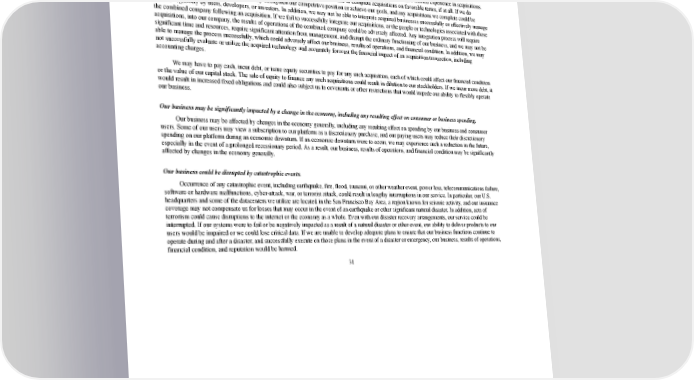 2/24/2018 S-1 Table of Contents • increase our technical support costs; and • harm our reputation and brand. We may acquire other businesses or receive offers to be acquired, which could require significant management attention, disrupt our business, or dilute stockholder value. Part of our business strategy is to make acquisitions of other companies, products, and technologies. We have limited experience in acquisitions. We may not be able to find suitable acquisition candidates and we may not be able to complete acquisitions on favorable terms, if at all. If we do complete acquisitions, we may not ultimately strengthen our competitive position or achieve our goals, and any acquisitions we complete could be viewed negatively by users, developers, or investors. In addition, we may not be able to integrate acquired businesses successfully or effectively manage the combined company following an acquisition. If we fail to successfully integrate our acquisitions, or the people or technologies associated with those acquisitions, into our company, the results of operations of the combined company could be adversely affected. Any integration process will require significant time and resources, require significant attention from management, and disrupt the ordinary functioning of our business, and we may not be able to manage the process successfully, which could adversely affect our business, results of operations, and financial condition. In addition, we may not successfully evaluate or utilize the acquired technology and accurately forecast the financial impact of an acquisition transaction, including accounting charges. We may have to pay cash, incur debt, or issue equity securities to pay for any such acquisition, each of which could affect our financial condition or the value of our capital stock. The sale of equity to finance any such acquisitions could result in dilution to our stockholders. If we incur more debt, it would result in increased fixed obligations and could also subject us to covenants or other restrictions that would impede our ability to flexibly operate our business. Our business may be significantly impacted by a change in the economy, including any resulting effect on consumer or business spending. Our business may be affected by changes in the economy generally, including any resulting effect on spending by our business and consumer users. Some of our users may view a subscription to our platform as a discretionary purchase, and our paying users may reduce their discretionary spending on our platform during an economic downturn. If an economic downturn were to occur, we may experience such a reduction in the future, especially in the event of a prolonged recessionary period. As a result, our business, results of operations, and financial condition may be significantly affected by changes in the economy generally. Our business could be disrupted by catastrophic events. Occurrence of any catastrophic event, including earthquake, fire, flood, tsunami, or other weather event, power loss, telecommunications failure, software or hardware malfunctions, cyberattack, war, or terrorist attack, could result in lengthy interruptions in our service. In particular, our U.S. headquarters and some of the datacenters we utilize are located in the San Francisco Bay Area, a region known for seismic activity, and our insurance coverage may not compensate us for losses that may occur in the event of an earthquake or other significant natural disaster. In addition, acts of terrorism could cause disruptions to the internet or the economy as a whole. Even with our disaster recovery arrangements, our service could be interrupted. If our systems were to fail or be negatively impacted as a result of a natural disaster or other event, our ability to deliver products to our users would be impaired or we could lose critical data. If we are unable to develop adequate plans to ensure that our business functions continue to operate during and after a disaster, and successfully execute on those plans in the event of a disaster or emergency, our business, results of operations, financial condition, and reputation would be harmed. 31 https://www.sec.gov/Archives/edgar/data/1467623/000119312518055809/d451946ds1.htm 38/235