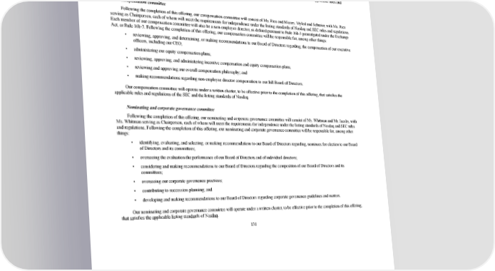 2/24/2018 S-1 Table of Contents • overseeing compliance with our code of business conduct and ethics; • reviewing related party transactions; and • preapproving all audit and all permissible nonaudit services, other than de minimis nonaudit services, to be performed by the independent registered public accounting firm. Our audit committee will operate under a written charter, to be effective prior to the completion of this offering, that satisfies the applicable rules and regulations of the SEC and the listing standards of Nasdaq. Compensation committee Following the completion of this offering, our compensation committee will consist of Ms. Rice and Messrs. Mylod and Schreier, with Ms. Rice serving as Chairperson, each of whom will meet the requirements for independence under the listing standards of Nasdaq and SEC rules and regulations. Each member of our compensation committee will also be a nonemployee director, as defined pursuant to Rule 16b3 promulgated under the Exchange Act, or Rule 16b3. Following the completion of this offering, our compensation committee will be responsible for, among other things: • reviewing, approving, and determining, or making recommendations to our Board of Directors regarding, the compensation of our executive officers, including our CEO; • administering our equity compensation plans; • reviewing, approving, and administering incentive compensation and equity compensation plans; • reviewing and approving our overall compensation philosophy; and • making recommendations regarding nonemployee director compensation to our full Board of Directors. Our compensation committee will operate under a written charter, to be effective prior to the completion of this offering, that satisfies the applicable rules and regulations of the SEC and the listing standards of Nasdaq. Nominating and corporate governance committee Following the completion of this offering, our nominating and corporate governance committee will consist of Ms. Whitman and Mr. Jacobs, with Ms. Whitman serving as Chairperson, each of whom will meet the requirements for independence under the listing standards of Nasdaq and SEC rules and regulations. Following the completion of this offering, our nominating and corporate governance committee will be responsible for, among other things: • identifying, evaluating, and selecting, or making recommendations to our Board of Directors regarding, nominees for election to our Board of Directors and its committees; • overseeing the evaluation the performance of our Board of Directors and of individual directors; • considering and making recommendations to our Board of Directors regarding the composition of our Board of Directors and its committees; • overseeing our corporate governance practices; • contributing to succession planning; and • developing and making recommendations to our Board of Directors regarding corporate governance guidelines and matters. Our nominating and corporate governance committee will operate under a written charter, to be effective prior to the completion of this offering, that satisfies the applicable listing standards of Nasdaq. 131 https://www.sec.gov/Archives/edgar/data/1467623/000119312518055809/d451946ds1.htm 139/235