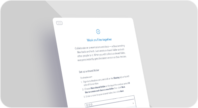 home 4 Work on files together Collaborate on presentations and docs — without emailing files back and forth. Just create a shared folder and add other people to it. When you edit a file in a shared folder, everyone instantly gets the latest version on their devices. Set up a shared folder On dropbox.com 1. Sign in to dropbox.com, and click on the Sharing tab on the left side of the window. 2. Choose New shared folder at the top of the window, select I ’d like to create and share a new folder, then click Next. 3. Enter a name for your shared folder, then click Next. continued