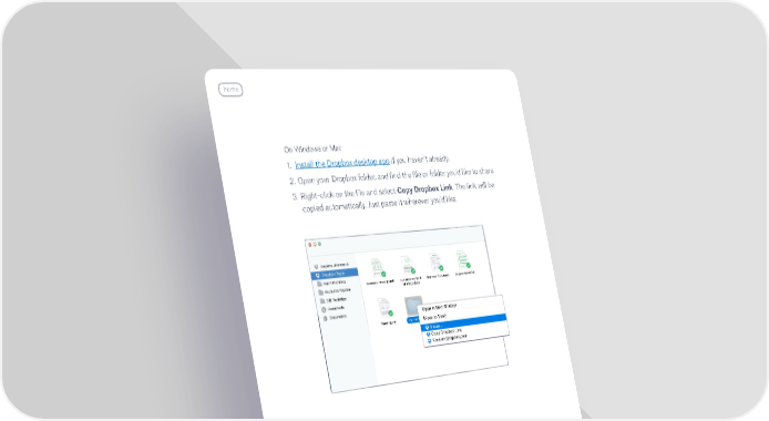 home On Windows or Mac 1. Install the Dropbox desktop app i f you haven’t already. 2. Open your Dropbox folder, and find the file or folder you’d like to share. 3. Right-click on the file and select Copy Dropbox Link. The link will be copied automatically. Just paste it wherever you’d like. continued