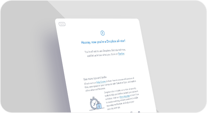 home 5 Hooray, now you’re a Dropbox all-star! You’re all set to use Dropbox. Get started now, and let us know what you think on Twitter. See more tips and tricks Check out our Help Centre to learn how to recover old versions of files, save space on your computer with Selective Sync, and explore other advanced features. Dropbox also includes a number of security tools to help you further protect your account and data. Visit our Security page to learn how to create a strong, unique password, enable two-step verification, and adjust your security settings. There’s even more to Dropbox Need more space or extra sharing controls? Learn more about Dropbox Plus. Looking for a better way to collaborate at work? Learn more about Dropbox Business. continued