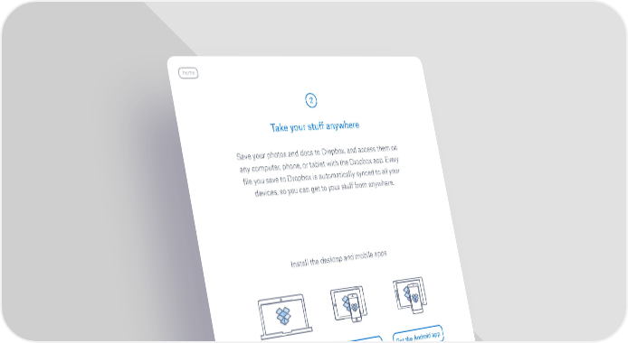 home 2 Take your stuff anywhere Save your photos and docs to Dropbox, and access them on any computer, phone, or tablet with the Dropbox app. Every file you save to Dropbox is automatically synced to all your devices, so you can get to your stuff from anywhere. Install the desktop and mobile apps Get the desktop app Get the iOS app Get the Android app continued