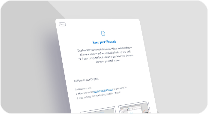 home 1 Keep your files safe Dropbox lets you save photos, docs, videos and other files — all in one place — and automatically backs up your stuff. So if your computer breaks down or you leave your phone on the train, your stuff is safe. Add files to your Dropbox On Windows or Mac 1. Make sure you’ve installed the desktop app on your computer. 2. Drag and drop files into the Dropbox folder. That’s it! WINDOWS MAC continued