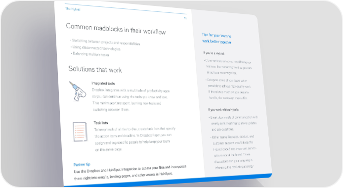 The Hybrid 15 Common roadblocks in their workflow Tips for your team to work better together • Switching between projects and responsibilities • Using disconnected technologies If you’re a Hybrid: • Balancing multiple tasks • Communicate what you need from your team on the marketing front so you can Solutions that work all achieve more together • Delegate some of your tasks when Integrated tools possible to achieve high-quality work Dropbox integrates with a multitude of productivity apps If there’s too much on your plate to so you can continue using the tools you know and love handle, the campaign may suffer This minimizes time spent learning new tools and switching between them If you work with a Hybrid: • Break down walls of communication with Task lists weekly sync meetings to share updates To keep track of all the to-dos, create task lists that specify and ask questions the action item and deadline In Dropbox Paper, you can assign and tag specific people to help keep your team • Other teams like sales, product, and on the same page customer support should keep the Hybrid looped into important conver– Partner tip sations about the brand Those Use the Dropbox and HubSpot integration to access your files and incorporate discussions can go a long way in them right into emails, landing pages, and other assets in HubSpot. informing the marketing strategy